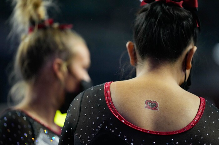 (Francisco Kjolseth | The Salt Lake Tribune) Utah gymnasts honor the memory of football players Ty Jordan and Aaron Lowe at the Best of Utah NCAA Gymnastics Meet at the Maverik Center in West Valley City on Friday, Jan. 7, 2022.