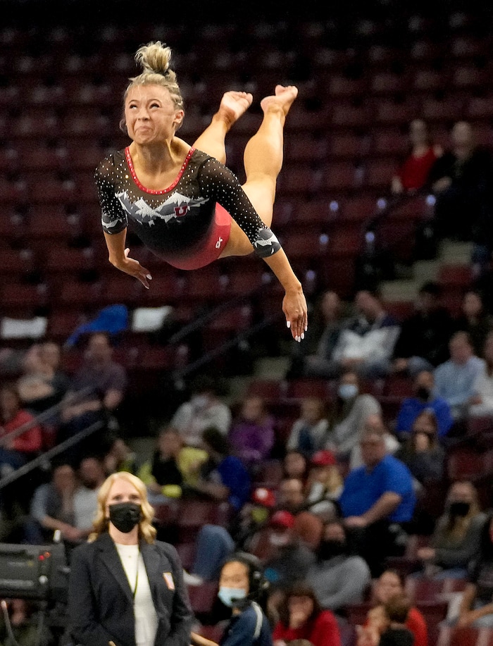 (Francisco Kjolseth | The Salt Lake Tribune) Utah’s Kara Eaker competes on the floor at the Best of Utah NCAA Gymnastics Meet at the Maverik Center in West Valley City on Friday, Jan. 7, 2022.
