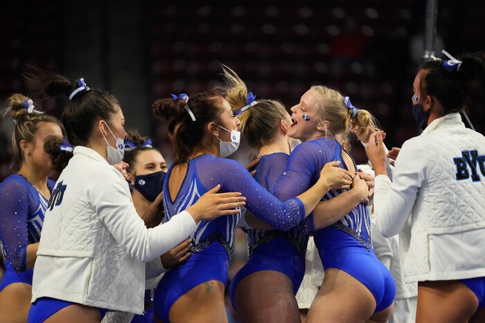 (Francisco Kjolseth | The Salt Lake Tribune) BYU celebrates their team performance on the bars at the Best of Utah NCAA Gymnastics Meet at the Maverik Center in West Valley City on Friday, Jan. 7, 2022.