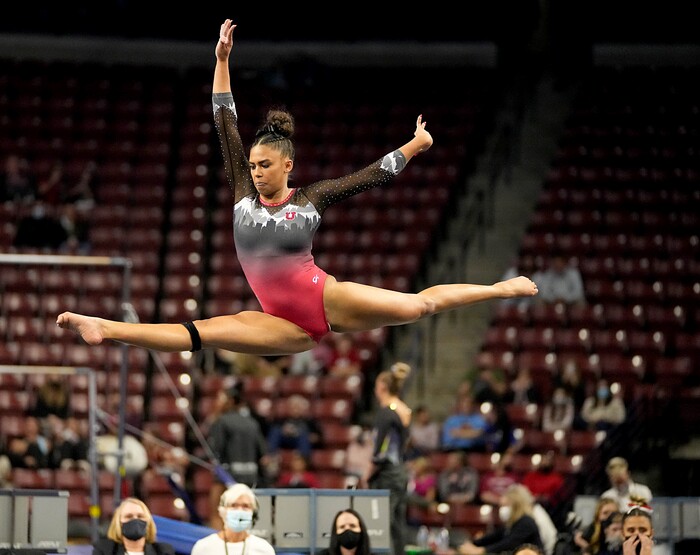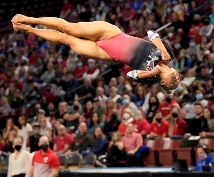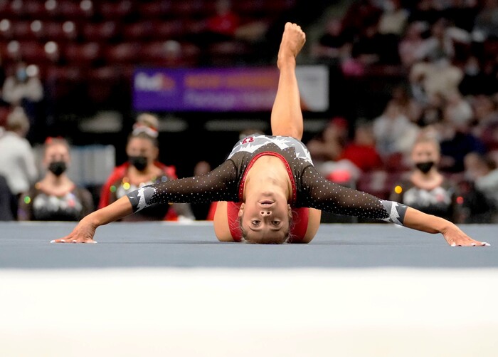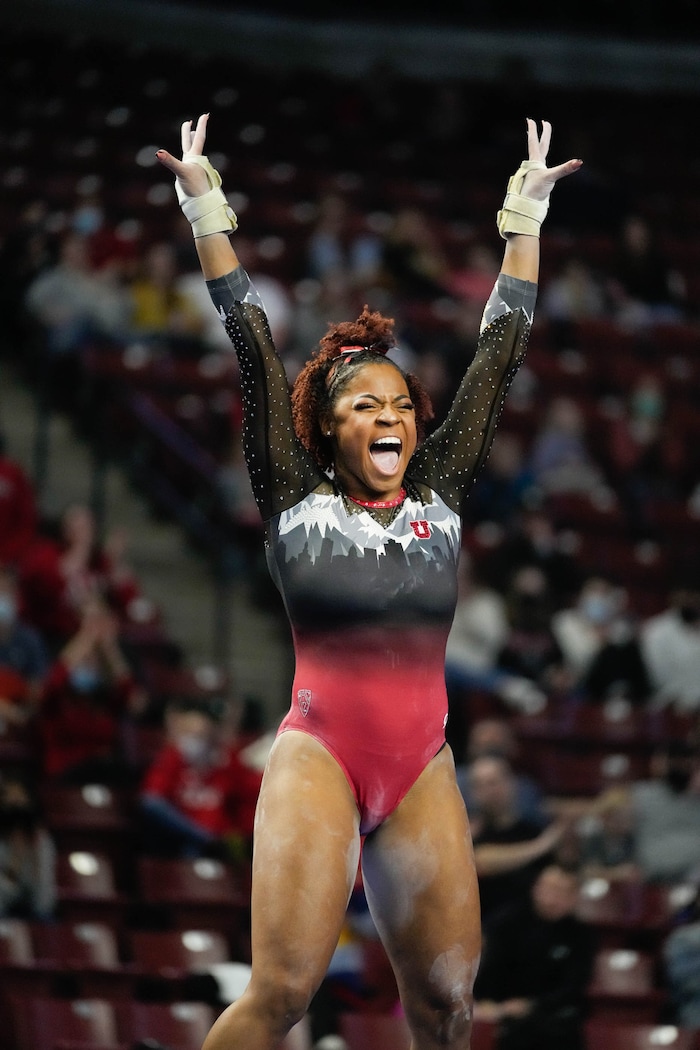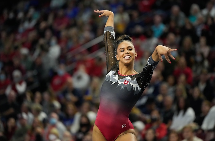 (Francisco Kjolseth | The Salt Lake Tribune) Utah’s Jaedyn Rucker performs her floor routine at the Best of Utah NCAA Gymnastics Meet at the Maverik Center in West Valley City on Friday, Jan. 7, 2022.