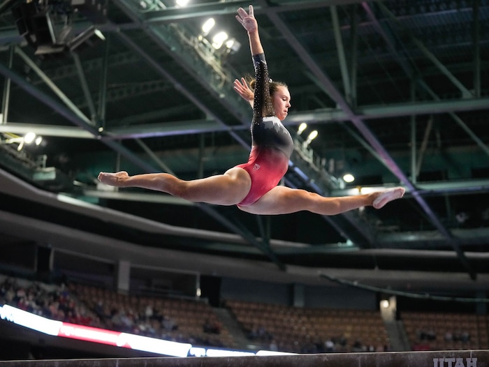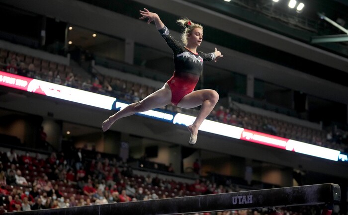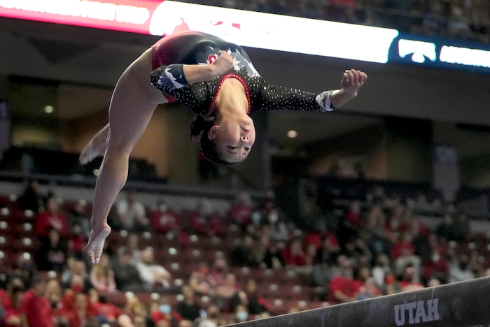 (Francisco Kjolseth | The Salt Lake Tribune) Utah’s Grace McCallum performs on the beam at the Best of Utah NCAA Gymnastics Meet at the Maverik Center in West Valley City on Friday, Jan. 7, 2022.