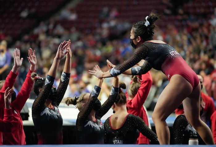 (Francisco Kjolseth | The Salt Lake Tribune) Utah’s Cristal Isa celebrates her performance on the beam with teammates at the Best of Utah NCAA Gymnastics Meet at the Maverik Center in West Valley City on Friday, Jan. 7, 2022.