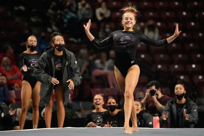 (Francisco Kjolseth | The Salt Lake Tribune) Southern Utah University’s Kayla Horton is cheered on by teammates as she completes her floor routine at the Best of Utah NCAA Gymnastics Meet at the Maverik Center in West Valley City on Friday, Jan. 7, 2022.