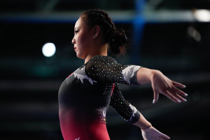 (Francisco Kjolseth | The Salt Lake Tribune) Utah’s Sage Thompson gets ready to compete on the parallel bars at the Best of Utah NCAA Gymnastics Meet at the Maverik Center in West Valley City on Friday, Jan. 7, 2022.