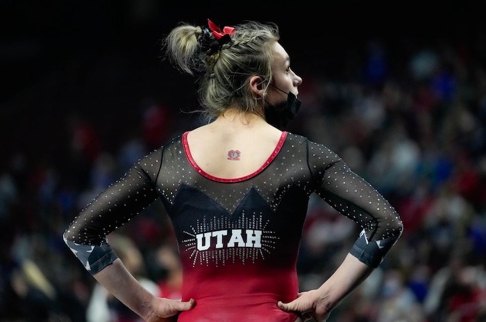 (Francisco Kjolseth | The Salt Lake Tribune) Utah’s Grace McCallum waits her turn on the floor as she honors the memory of football players Ty Jordan and Aaron Lowe along with the rest of the gymnastics team at the Best of Utah NCAA Gymnastics Meet at the Maverik Center in West Valley City on Friday, Jan. 7, 2022.