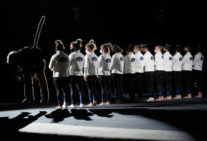 (Francisco Kjolseth | The Salt Lake Tribune) BYU is introduced at the Best of Utah NCAA Gymnastics Meet at the Maverik Center in West Valley City on Friday, Jan. 7, 2022.