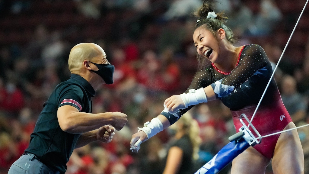(Francisco Kjolseth | The Salt Lake Tribune) Utah coach Tom Farden celebrates with Cristal Isa following her performance on the parallel bars at the Best of Utah NCAA Gymnastics Meet at the Maverik Center in West Valley City on Friday, Jan. 7, 2022.