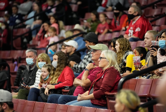 (Francisco Kjolseth | The Salt Lake Tribune) People take in the events at the Best of Utah NCAA Gymnastics Meet at the Maverik Center in West Valley City on Friday, Jan. 7, 2022.