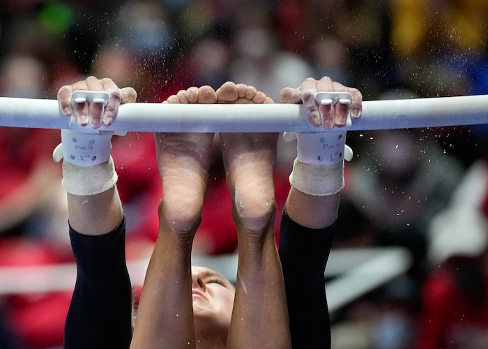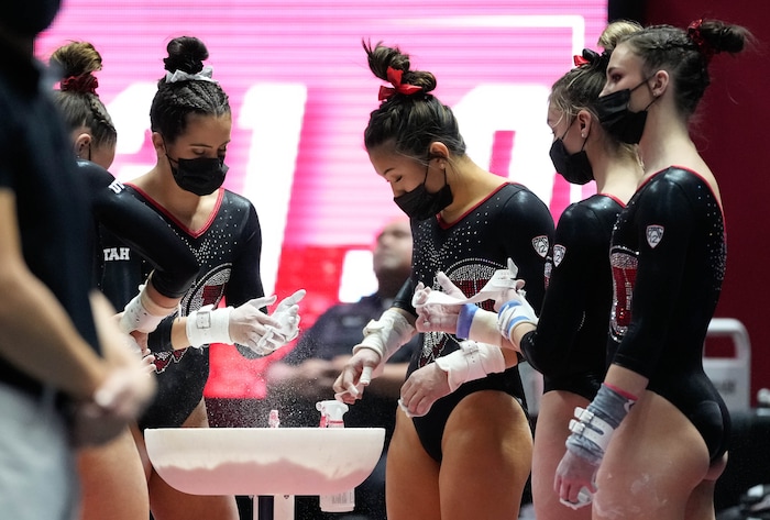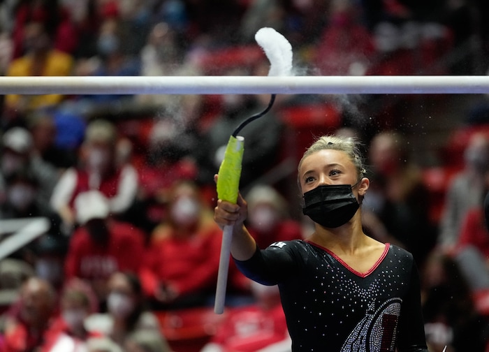 (Francisco Kjolseth | The Salt Lake Tribune) Utah chalks up before competing on the bars during their gymnastics meet with Stanford at the Huntsman Center in Salt Lake City, Saturday, Jan. 29, 2022.
