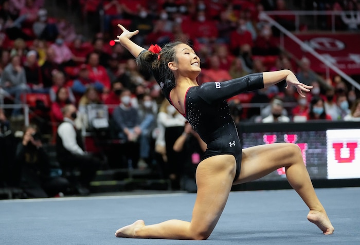 (Francisco Kjolseth | The Salt Lake Tribune) Utah’s Maile O’Keefe competes on the floor during their gymnastics meet with Stanford at the Huntsman Center in Salt Lake City, Saturday, Jan. 29, 2022.