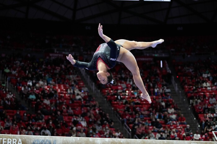 (Francisco Kjolseth | The Salt Lake Tribune) Utah’s Adrianne Randall dismounts the beam during their gymnastics meet with Stanford at the Huntsman Center in Salt Lake City, Saturday, Jan. 29, 2022.