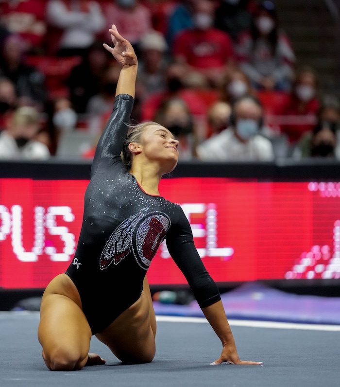 (Francisco Kjolseth | The Salt Lake Tribune) Utah’s Jaedyn Rucker dances part of her floor routine during their gymnastics meet with Stanford at the Huntsman Center in Salt Lake City, Saturday, Jan. 29, 2022.
