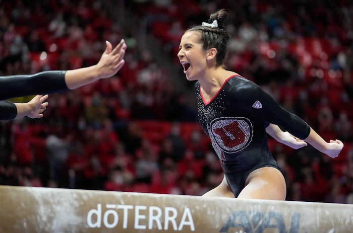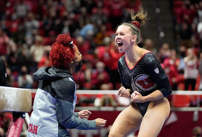 (Francisco Kjolseth | The Salt Lake Tribune) Utah’s Maile O’Keefe performs celebrates her perfect 10 on the beam during the gymnastics meet with Stanford at the Huntsman Center in Salt Lake City, Saturday, Jan. 29, 2022.