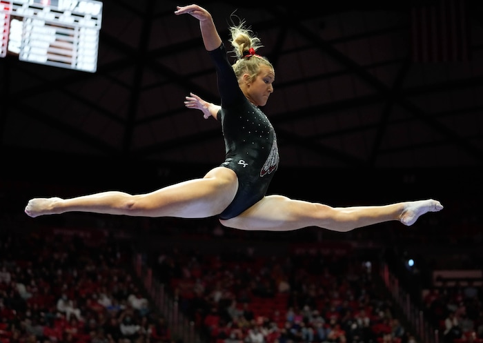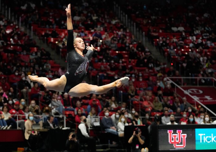 (Francisco Kjolseth | The Salt Lake Tribune) Utah’s Sydney Soloski competes on the floor during their gymnastics meet with Stanford at the Huntsman Center in Salt Lake City, Saturday, Jan. 29, 2022.