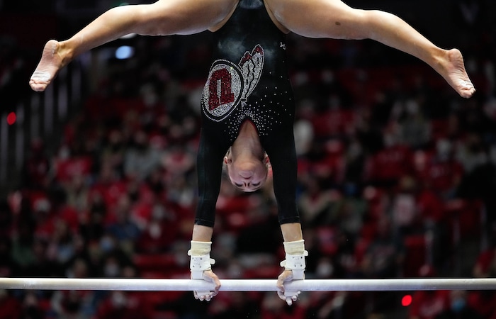 (Francisco Kjolseth | The Salt Lake Tribune) Utah’s Sage Thompson competes on the bars during their gymnastics meet with Stanford at the Huntsman Center in Salt Lake City, Saturday, Jan. 29, 2022.