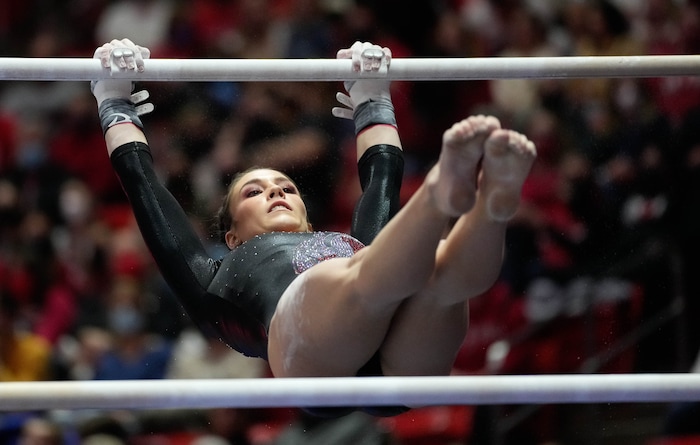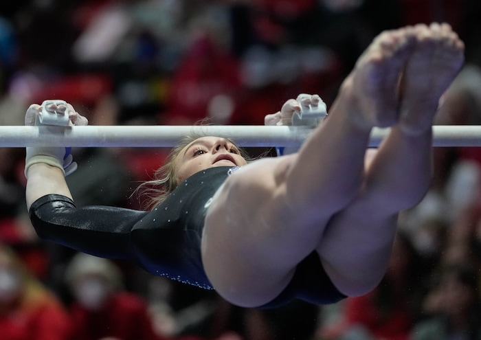 (Francisco Kjolseth | The Salt Lake Tribune) Utah’s Grace McCallum competes on bars during their gymnastics meet with Stanford at the Huntsman Center in Salt Lake City, Saturday, Jan. 29, 2022.