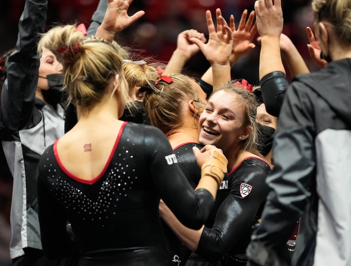 (Francisco Kjolseth | The Salt Lake Tribune) Utah’s Grace McCallum is celebrated by teammates following her floor routine during their gymnastics meet with Stanford at the Huntsman Center in Salt Lake City, Saturday, Jan. 29, 2022.