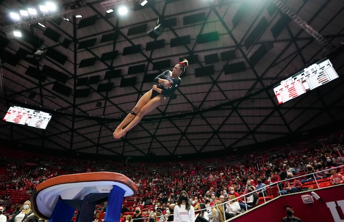 (Francisco Kjolseth | The Salt Lake Tribune) Utah’s Jaedyn Rucker launches off the vault during their gymnastics meet with Stanford at the Huntsman Center in Salt Lake City, Saturday, Jan. 29, 2022.
