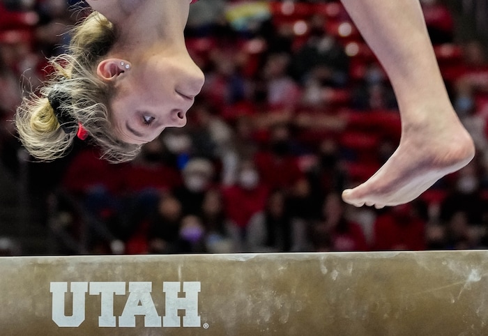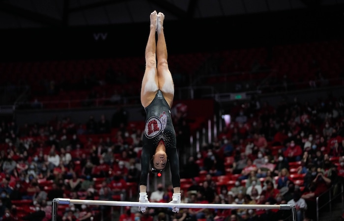(Francisco Kjolseth | The Salt Lake Tribune) Utah competes during their gymnastics meet with Stanford at the Huntsman Center in Salt Lake City, Saturday, Jan. 29, 2022.