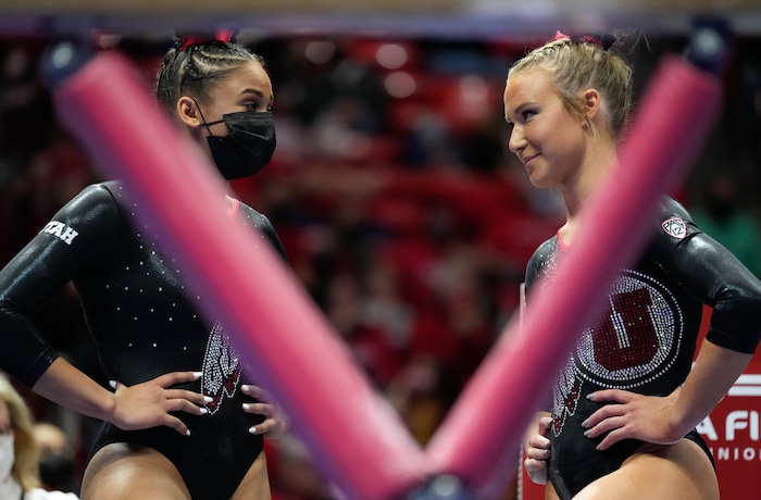 (Francisco Kjolseth | The Salt Lake Tribune) Utah’s Jaedyn Rucker, left, encourages Abby Paulson before her time on the beam during their gymnastics meet with Stanford at the Huntsman Center in Salt Lake City, Saturday, Jan. 29, 2022.