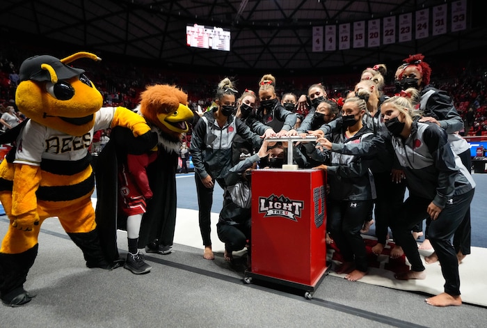 (Francisco Kjolseth | The Salt Lake Tribune) Utah lights up the U after beating Stanford 197.675 to 196.000 during their gymnastics meet at the Huntsman Center in Salt Lake City, Saturday, Jan. 29, 2022.