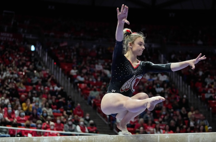 (Francisco Kjolseth | The Salt Lake Tribune) Utah’s Maile O’Keefe performs a perfect 10 on the beam during the gymnastics meet with Stanford at the Huntsman Center in Salt Lake City, Saturday, Jan. 29, 2022.