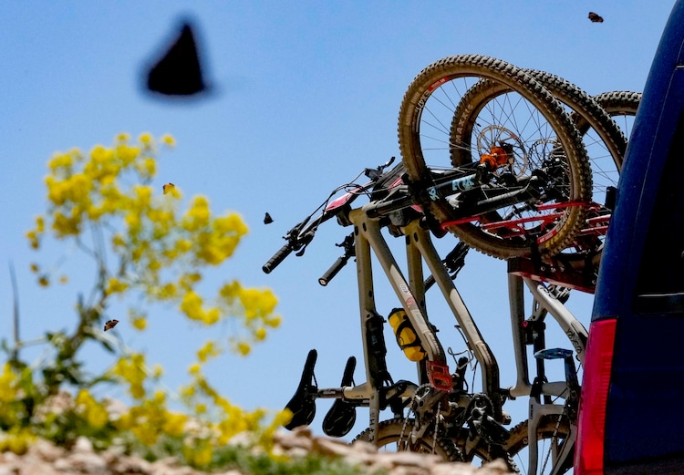 (Francisco Kjolseth | The Salt Lake Tribune) Thousands of painted lady butterflies flutter past mountain bikes near Hidden Lake Lodge at Powder Mountain on Monday, July 12, 2022. Powder Mountain has renamed itself "Dirt Mountain" for the summers after this year installing its first three downhill mountain biking courses.
