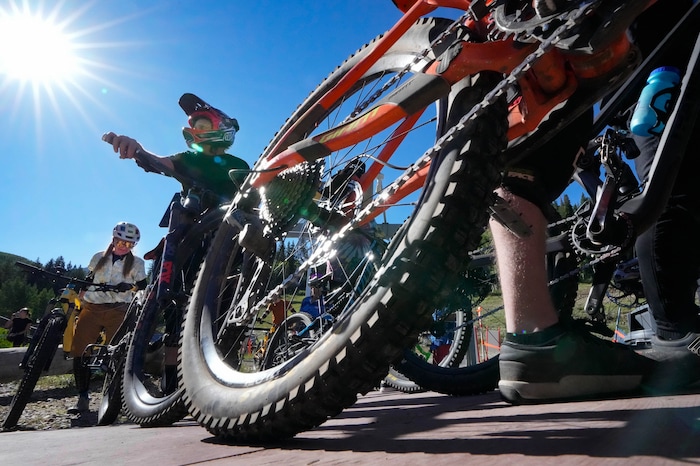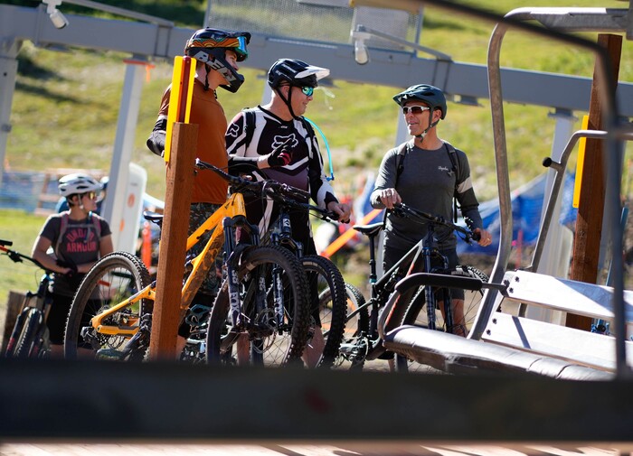 (Francisco Kjolseth | The Salt Lake Tribune) Mountain bike riders catch some of the first chairs on the Moonbeam lift at Solitude Mountain Resort for lift-served mountain biking on Friday, Sept. 8, 2023.