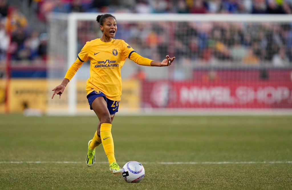 (Francisco Kjolseth | The Salt Lake Tribune) Utah Royals forward Ally Sentnor (9) during their season opener at America First Field Saturday, March 16, 2024, in Sandy, Utah.