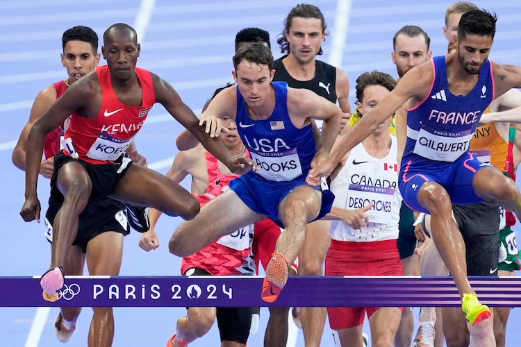 (Martin Meissner | AP) Kenneth Rooks, center, of the United States, competes in a men's 3000 meters steeplechase round 1 heat at the 2024 Summer Olympics, Monday, Aug. 5, 2024, in Saint-Denis, France.