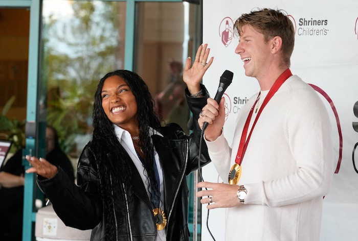 (Francisco Kjolseth | The Salt Lake Tribune) Hunter Woodhall and Tara Davis-Woodhall, both gold medalists in the Paris 2024 Games, recount their Olympic wins as they visit with kids at Shriners Children’s Hospital on Wednesday, Sept. 18, 2024. Woodhall had his legs amputated when he was 11 months old and spent much of his youth at the hospital.
