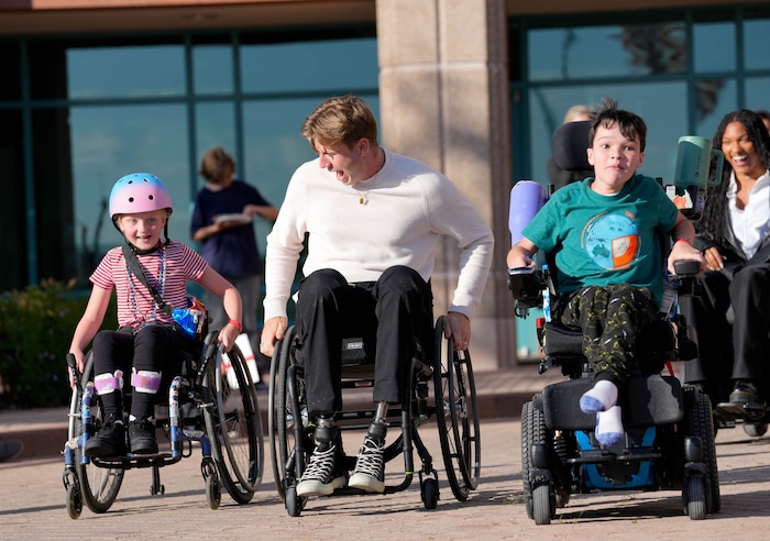 Gray, who has two club feet as a result of a hereditary condition, channeled the leopard print on her shirt and sprung into the lead as soon as the racers were given the signal to start. The sixth grader at East Lake Elementary could have finished her math homework before Woodhall, who hasn’t used a wheelchair since he was a young patient at Shriners Children’s, completed the wheeled race around the hospital’s driveway Wednesday.