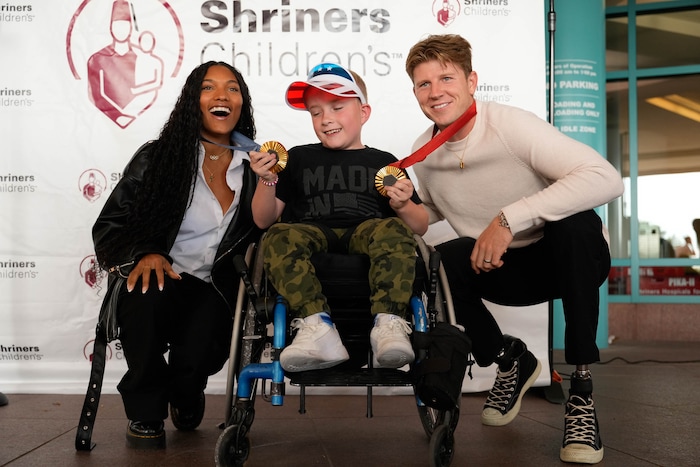 (Francisco Kjolseth | The Salt Lake Tribune) Cole Spencer, 10, poses for a photograph with Tara Davis-Woodhall and Hunter Woodhall, both gold medalists in the Paris 2024 Games, during a visit to Shriners Children’s Hospital on Wednesday, Sept. 18, 2024. Woodhall had his legs amputated when he was 11 months old and spent much of his youth at the hospital.