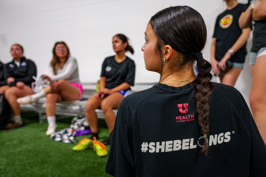 Madyson Fuimaono was the first of her teammates to arrive at a recent Friday evening practice, already wearing her turquoise cleats. It’s her fourth year on a club team, Fuimaono said, adding that she joined #SheBelongs not only to grow her athletic skills but to create “connections.”