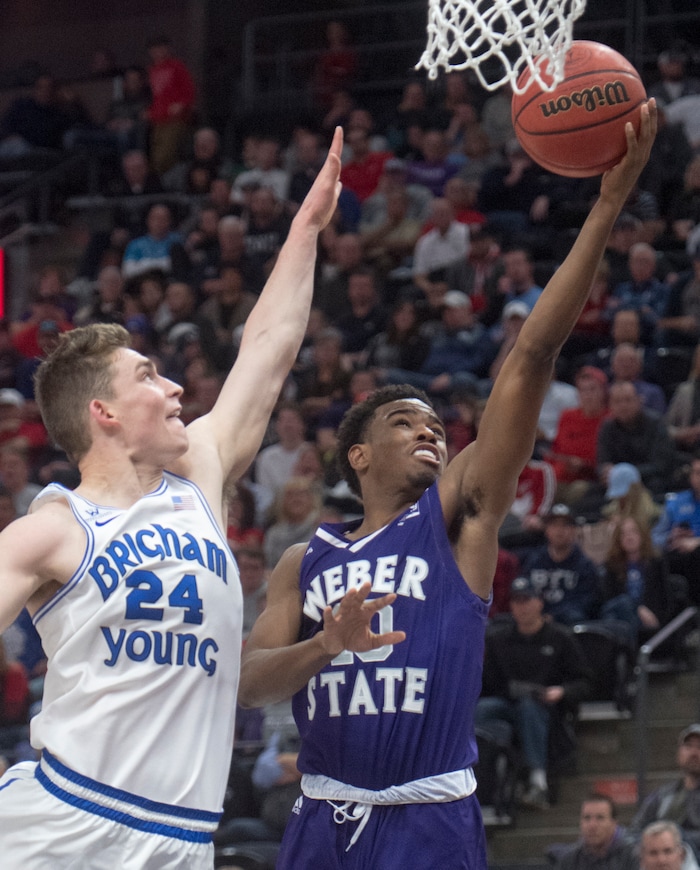 (Rick Egan | The Salt Lake Tribune) Weber State Wildcats guard Jerrick Harding (10) shoots as Brigham Young Cougars guard McKay Cannon (24) defends, in Beehive Classic basketball action at the Vivint SmartHome Arena, Saturday, December 9, 2017.