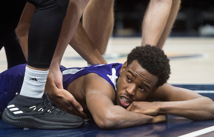 (Rick Egan | The Salt Lake Tribune) Weber State Wildcats guard Jerrick Harding (10) takes his time getting up, after loosing the ball out of bounds with 12 seconds left in the game, at BYU beat Weber State 74-68, in Beehive Classic basketball action at the Vivint SmartHome Arena, Saturday, December 9, 2017.