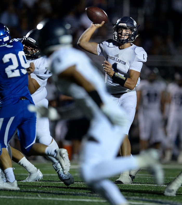 (Scott Sommerdorf | The Salt Lake Tribune) Corner Canyon QB Zach Wilson makes a throw behind his offensive line during first half play. Corner Canyon led Pleasant Grove 14-3 at the half, Friday, August 18, 2017. led Pleasant Grove 14-3 at the half, Friday, August 18, 2017.