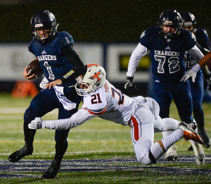 (Francisco Kjolseth | The Salt Lake Tribune) Corner Canyon quarterback Zach Wilson puts in a few yards before being taken down by Karene Reid of Timpview in game action between Timpview at Corner Canyon on Thursday, Sept. 21, 2017.