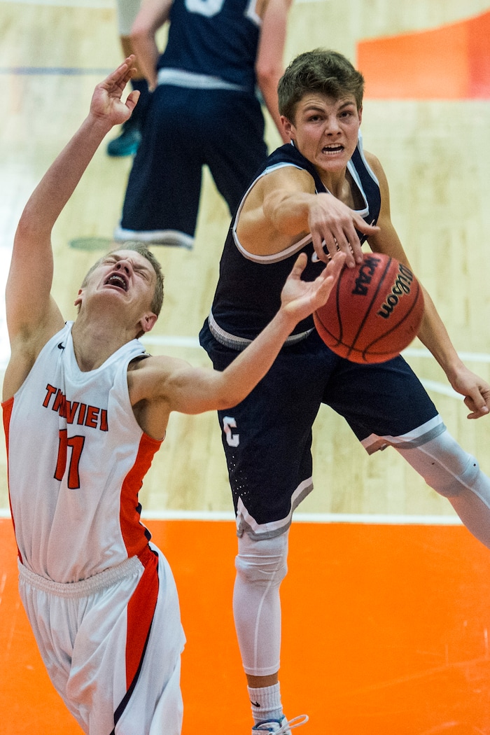 Timpview's Levi Wilson (11) is fouled by Corner Canyon's Zach Wilson (1) during the game at Timpview High School Friday January 22, 2016.