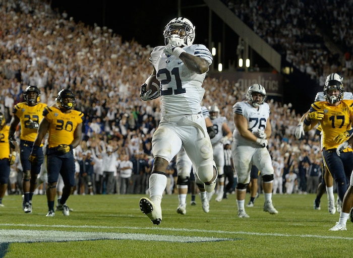 BYU RB Jamaal Williams (21) scores his fifth TD on a 14 yard run to give BYU a 52-45 fourth quarter lead. BYU defeated Toledo 55-53, Friday, September 30, 2016.