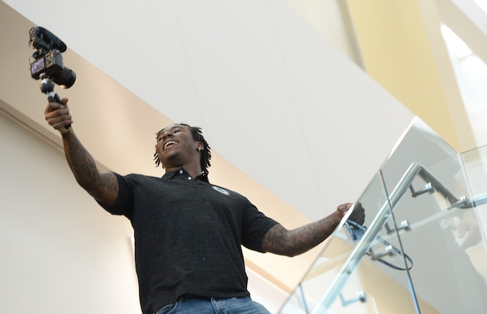 (Francisco Kjolseth | The Salt Lake Tribune) Former BYU football player Jamaal Williams, now with the Green Bay Packers works the selfie camera during media day at the BYU-Broadcasting Building on Friday, June 22, 2018.