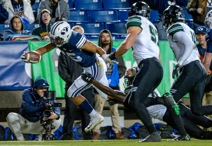 Leah Hogsten | The Salt Lake Tribune Brigham Young Cougars wide receiver Aleva Hifo (15) dives into the end zone for a touchdown as Brigham Young University hosts Hawaii at Lavell Edwards Stadium in Provo, Saturday Oct. 13, 2018. BYU defeated Hawaii 49-23.
