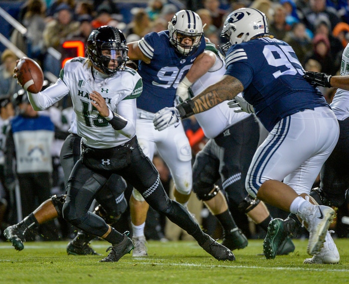 Leah Hogsten | The Salt Lake Tribune as Brigham Young University hosts Hawaii at Lavell Edwards Stadium in Provo, Saturday Oct. 13, 2018.