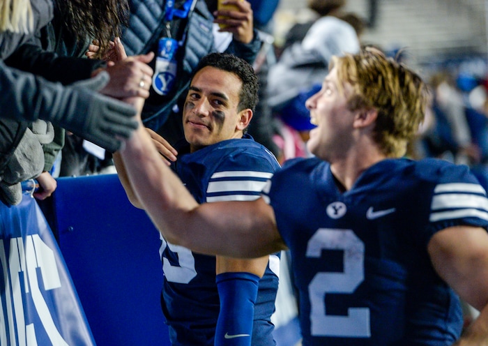 Leah Hogsten | The Salt Lake Tribune l-r Brigham Young Cougars linebacker Isaiah Kaufusi (53) and Brigham Young Cougars running back Matt Hadley (2) celebrate the win with fans over Hawaii at Lavell Edwards Stadium in Provo, Saturday Oct. 13, 2018. BYU defeated Hawaii 49-23.