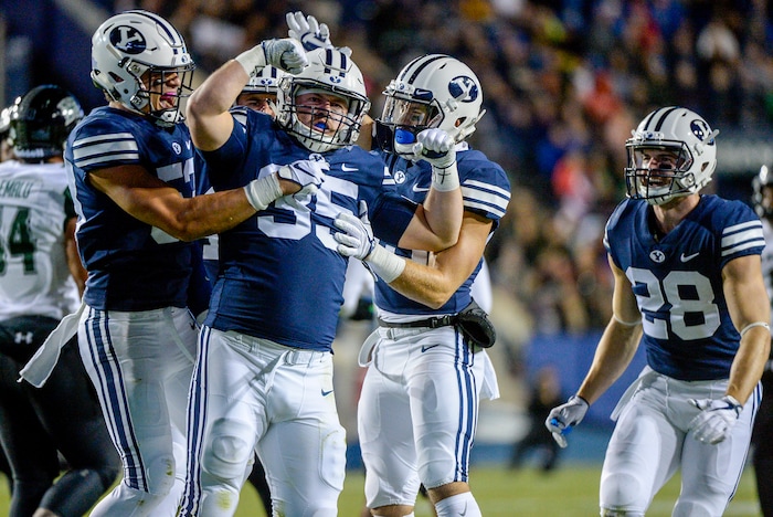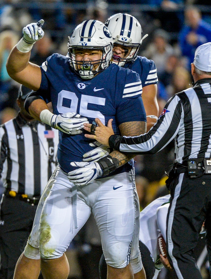Leah Hogsten | The Salt Lake Tribune Brigham Young Cougars defensive lineman Lorenzo Fauatea (55) and Brigham Young Cougars defensive back Austin Lee (11) celebrate shutting down the Warrior offense as Brigham Young University hosts Hawaii at Lavell Edwards Stadium in Provo, Saturday Oct. 13, 2018.