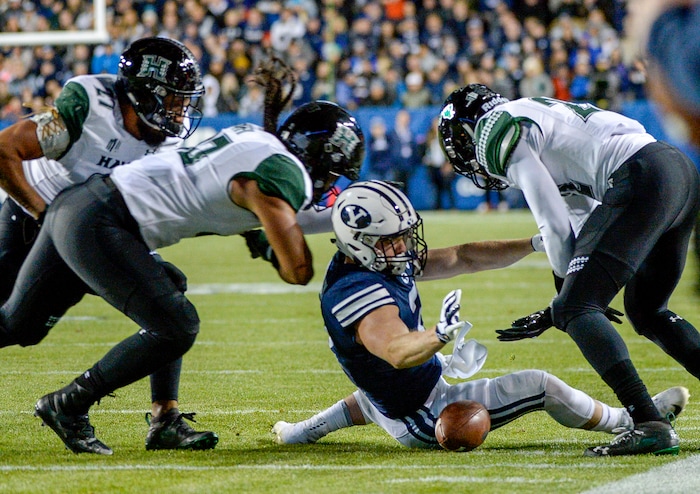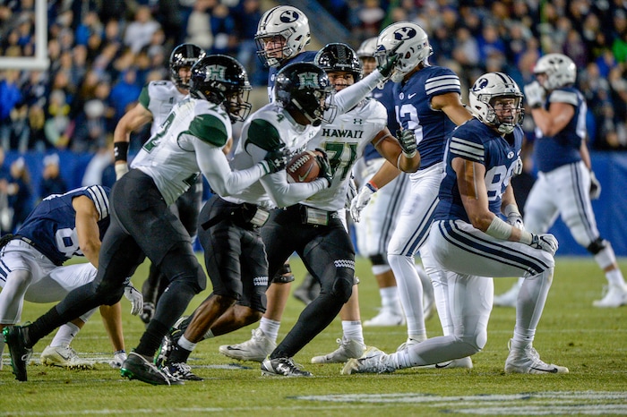 • BYU safety Dayan Ghanwoloku’s fumble recovery. Having returned to the lineup for the first time since the Wisconsin game, the junior pounced on a fumbled punt after BYU’s second-straight three-and-out in the second half. Hawaii had trimmed the big BYU lead to 28-10 and had all the momentum until Ghanwoloku’s third recovery of the season.