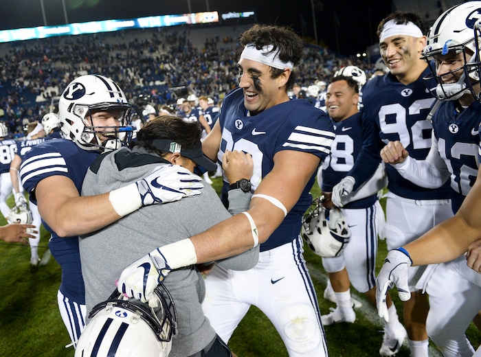 Leah Hogsten | The Salt Lake Tribune The Cougars celebrate the win over Hawaii at Lavell Edwards Stadium in Provo, Saturday Oct. 13, 2018. BYU defeated Hawaii 49-23.