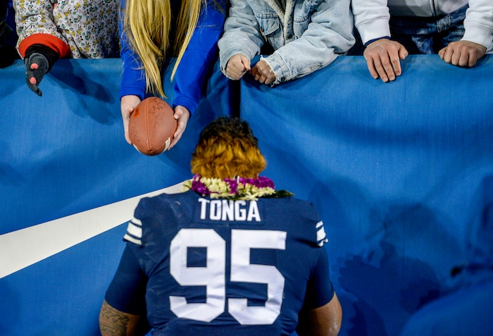 Leah Hogsten | The Salt Lake Tribune Brigham Young Cougars defensive lineman Khyiris Tonga (95) signs autographs for fans after BYU defeated Hawaii 49-23 at Lavell Edwards Stadium in Provo, Saturday Oct. 13, 2018.