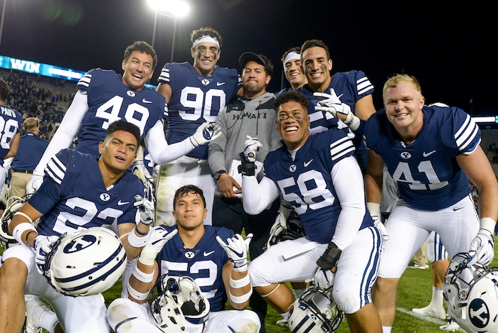 Leah Hogsten | The Salt Lake Tribune Brigham Young players pose with former BYU player Va'a Niumatalolo, who is now a graduate assistant at Hawaii after the game at Lavell Edwards Stadium in Provo, Saturday Oct. 13, 2018. BYU defeated Hawaii 49-23.