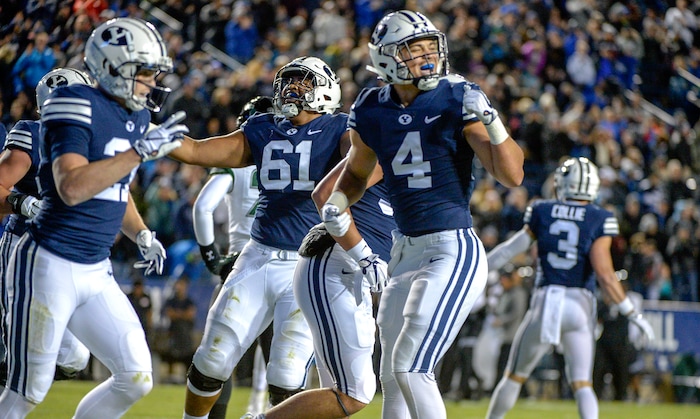 Leah Hogsten | The Salt Lake Tribune Brigham Young Cougars running back Lopini Katoa (4) celebrates his touchdown as Brigham Young University hosts Hawaii at Lavell Edwards Stadium in Provo, Saturday Oct. 13, 2018.